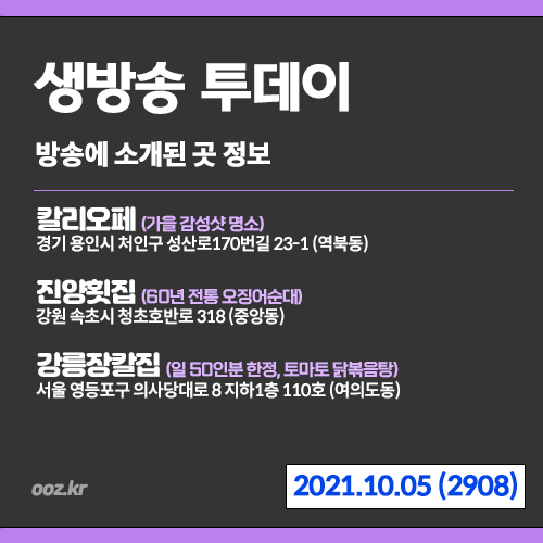20211005 (2908) 생방송 투데이 (2908) 빵집에 숨은 가을 감성샷 명소?, 명품도마, 60년 전통 오징어순대, 일 50인분 한정 토마토 닭볶음탕
