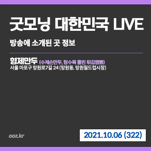 | 20211011 굿모닝 대한민국 LIVE (325) 팔도면객 - 강원도 강릉, 검은콩 장칼국수 (0) | 2021.10.11 |