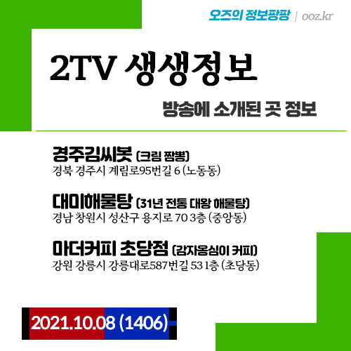 20211008 생생정보 (1406) 부드러운 한입 크림 짬뽕, 31년 전통 대왕 해물탕, 강릉 (별밤투어, 감자옹심이 커피, 꼬막비빔밥)