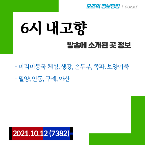 20211012 6시 내고향 (7382) 미리미동국 체험, 생강, 손두부, 쪽파, 보양어죽 (밀양, 안동, 구례, 아산)