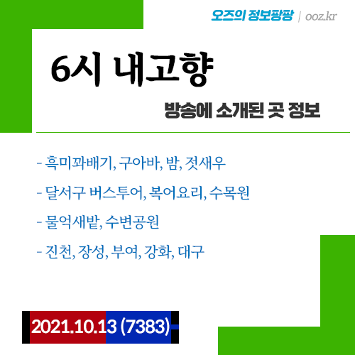 20211013 6시 내고향 (7383) 흑미 꽈배기, 구아바, 밤, 젓새우, 달서구 버스투어, 복어 요리, 수목원, 물억새밭, 수변공원 (진천, 장성, 부여, 강화, 대구)