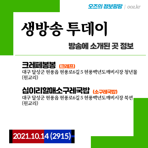 20211014 생방송 투데이 (2915) 나만의 디저트! 달콤함의 왕, 크레프, 소구레국밥 (대구 달성 현풍시장)
