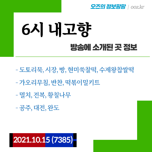 20211015 6시 내고향 (7385) 도토리묵, 시장, 빵, 현미쑥찰떡, 수제왕찹쌀떡, 가오리무침, 반찬, 떡볶이밀키트, 멸치, 전복, 황칠나무 (공주, 대전, 완도)