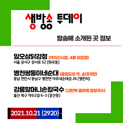 20211021 생방송 투데이 (2920) 4종 닭강정, 순대국밥, 고탄력 홍두깨 장칼국수