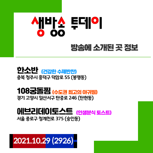 20211029 생방송 투데이 (2926) 인천 3GO 여행, 청주 봉명동 반찬가게, 수도권 최고의 아귀찜, 인생분식 - 동묘앞역 토스트