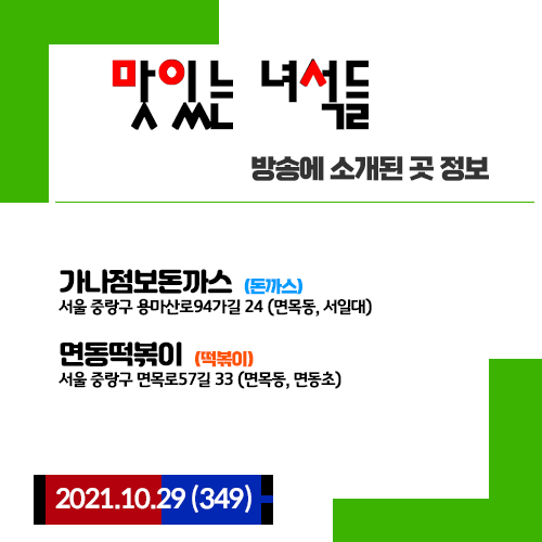 | 20211015 맛있는 녀석들 (347) 맛둥이 사장님 특집1탄 - 나폴리 (경남 하동), 요기국수김밥 (강원 속초), 하루방 (서울 삼성동) (0) | 2021.10.16 |