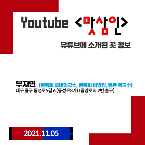 유튜브 <맛삼인> 11월5일 꿀 육회 물비빔국수 꿀 육회 비빔밥 얼큰 육국수 부자면 (대구 동성로3가, 중앙로역)
