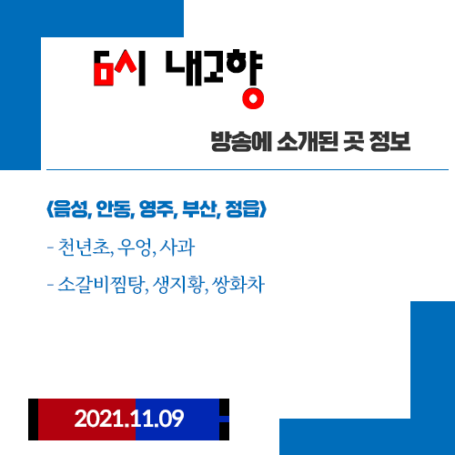 | 6시 내고향 11월10일 쪽파, 삼치, 더덕, 배추, 시장, 오일장, 돼지갈비, 활옥동굴, 갈대섬, 호암지 (부산, 포항, 정선, 충주) (0) | 2021.11.11 |
