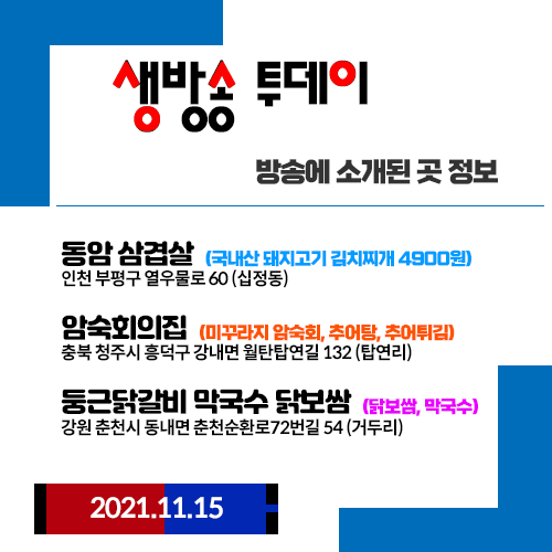 생방송 투데이 11월15일 국내산 돼지고기 김치찌개 4900원 (인천 십정동) 암숙회,추어탕,추어튀김 (충북 청주) 닭보쌈,막국수 (강원 춘천) 닭보쌈,고사리닭개장 (서울 상수동)