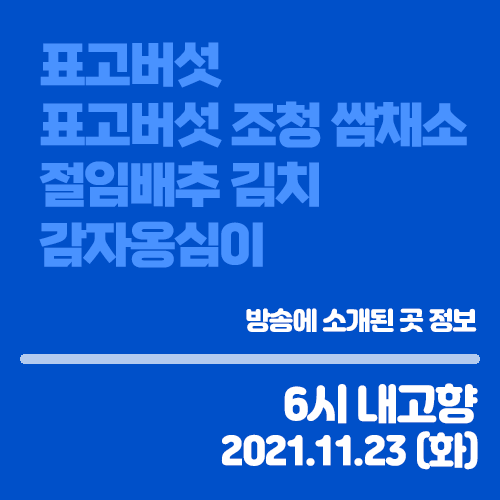 6시 내고향 11월23일 표고버섯 표고버섯 조청 (장흥) 쌈채소 (평택) 절임배추 김치 (원주) 감자옹심이 (강릉)