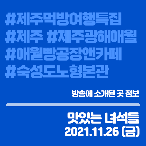 맛있는 녀석들 11월26일 제주 먹방여행 특집 제주광해애월 (제주 애월) 애월빵공장앤카페 (제주 애월) 숙성도노형본관 (제주 노형동)