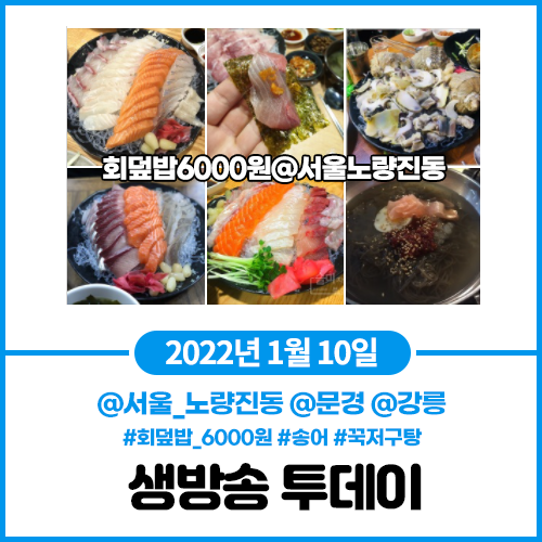 생방송 투데이 1월10일 맛있GO싸다GO 활어 회덮밥 단돈 6000원 (서울 노량진) 자족식당 쫄깃 탱글 송어 (문경 산북) 먹킷리스트 꾹저구탕 (강릉 연곡)