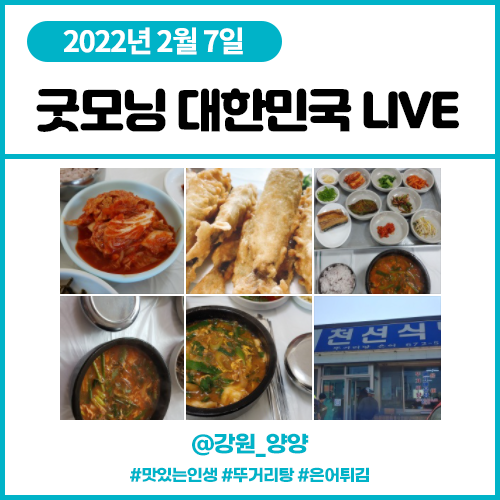 | 굿모닝 대한민국 LIVE 2월21일 맛있는 인생 옹심이 도토리국수, 소머리 곰탕 (강원 원주) (0) | 2022.02.21 |