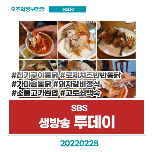 생방송 투데이 2월28일 전기구이통닭,로제치즈 반반통닭 (인천 동인천역) 가마솥통닭 (서울 종각역) 돼지갈비정식, 소불고기쌈밥 7,000원 (인천 간석오거리역) 고로쇠백숙 (남원)
