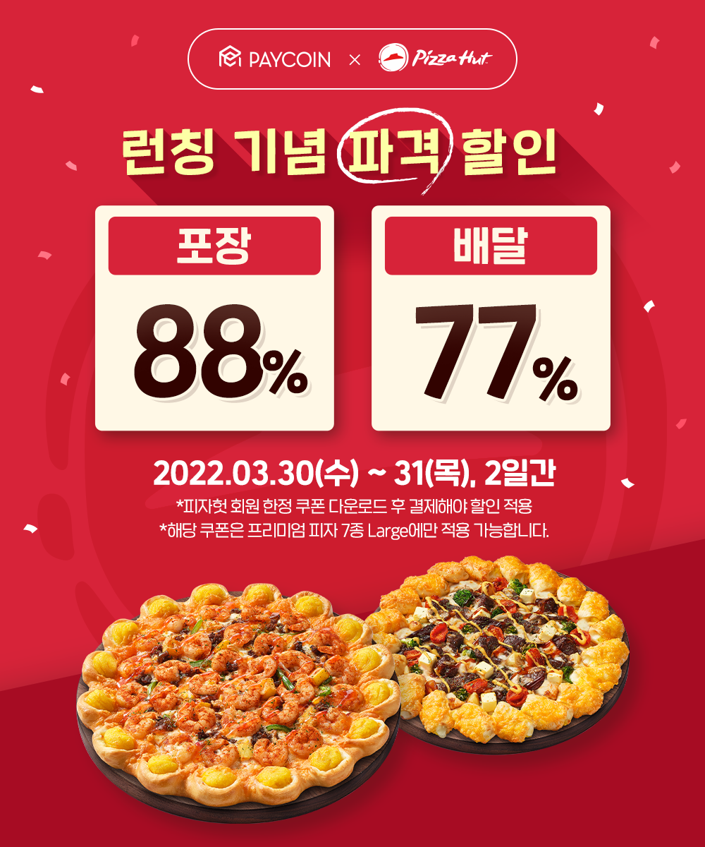 * 피자헛 채널 (홈페이지 또는 App) 회원 가입 및 로그인 후 페이코인 전용 할인 쿠폰을 다운로드 받아 적용시켜야 할인가로 결제 가능하며, 프리미엄 피자 7종 Large에 국한하여 이벤트 진행됩니다.