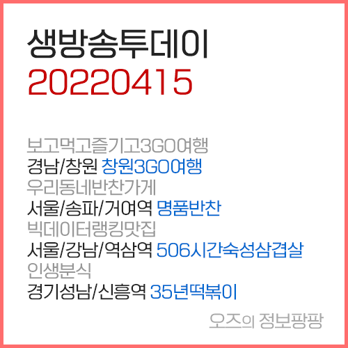 생방송 투데이 4월15일 [경남/창원] 창원3GO여행 [서울/거여역] 반찬가게 [서울/역삼역] 506시간 숙성 삼겹살 [성남/신흥역] 인생분식 35년 추억의 떡볶이