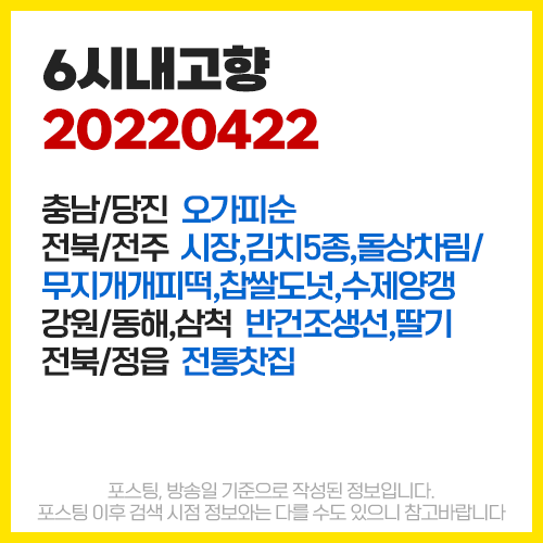 6시 내고향 4월22일 [충남/당진] 오가피순 [전북/전주] 시장,김치5종,돌상차림/무지개개피떡,찹쌀도넛,수제양갱 [강원/동해,삼척] 반건조생선,딸기 [전북/정읍] 전통찻집