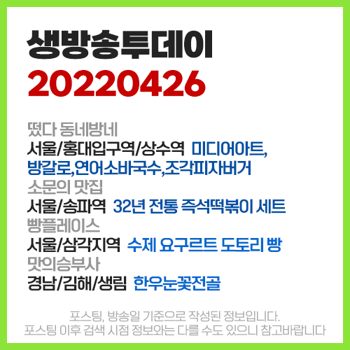 생방송 투데이 4월26일 [홍대입구역/상수동] 미디어아트,방갈로,연어소바,연어국수,미쁘동,조각피자버거 [송파역] 즉석떡볶이세트 [삼각지역] 수제요거트 도토리빵 [김해] 한우눈꽃전골