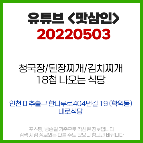 유튜브 <맛삼인> 5월3일 [인천/학익동] 대로식당 - 찌개 6000원 짜리 하나 시키면 반찬 18개 나오는 식당 (청국장/된장찌개/김치찌개)