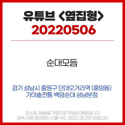 유튜브 <옆집형> 5월6일 [경기/성남/중앙동/단대오거리역] 가마솥전통 백암순대 성남본점 - 순대모듬