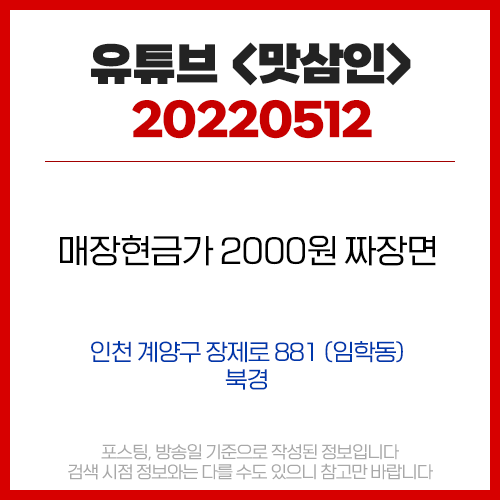 유튜브 <맛삼인> 5월12일 [인천/계양/임학동/임학역] 북경 - 매장현금가 2000원 짜장면 곱배기도 3000원 다른 메뉴들도 엄청 저렴~!