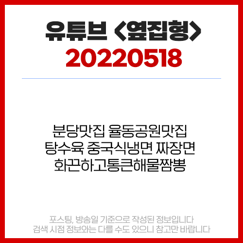유튜브 <옆집형> 5월18일 #분당맛집 #율동공원맛집 #중국식냉면 #탕수육 #짜장면 #화끈하고통큰해물짬뽕