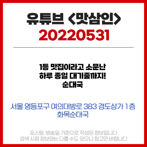 유튜브 <맛삼인> 5월31일 1등 맛집이라고 소문난 - 화목순대국 (서울 영등포구 여의도동, 샛강역)