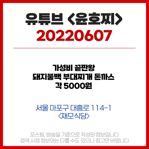 유튜브 <윤호찌> 6월7일 가성비 끝판왕 돼지불백, 부대찌개, 돈까스 각 5000원 - 재모식당 (서울 마포구 대흥동, 대흥역, 서강대 후문)