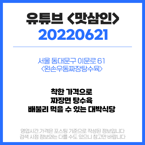 유튜브 <맛삼인> 맛집정보 (2022.06.21) 착한 가격으로 짜장면 탕수육을 배불리 - 왼손우동짜장탕수육 (서울 이문동 회기역 경희대 한국외대)