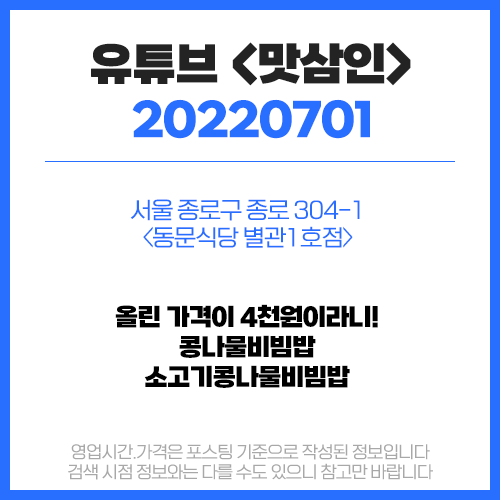 유튜브 <맛삼인> 맛집정보 - 콩나물비빔밥 4000원 소고기콩나물비빔밥 5000원 - 동문식당 별관1호점 (서울 창신동 동대문역)