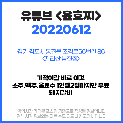 유튜브 <윤호찌> 맛집정보 (2022.06.12) 돼지갈비 / 소주.맥주.음료수 1인당2병까지 무료, 냉면.된장찌개.공기밥 - 지리산 (경기 김포 통진)