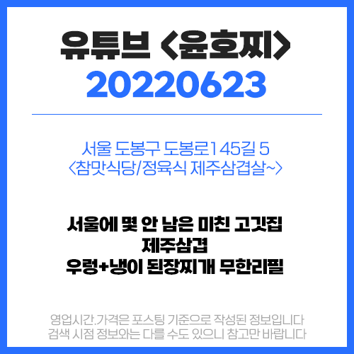 유튜브 <윤호찌> 맛집정보 (2022.06.23) 제주삼겹 - 참맛식당/정육식 제주삼겹살 한우소머리전문 (서울 도봉 방학동 방학역)