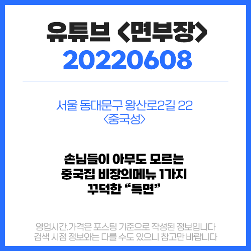 유튜브 <면부장> 맛집정보 (2022.06.08) 손님들이 아무도 모르는 중국집 비장의 메뉴 1가지 꾸덕한 "특면" - 중국성 (서울 동대문 신설동 신설동역)