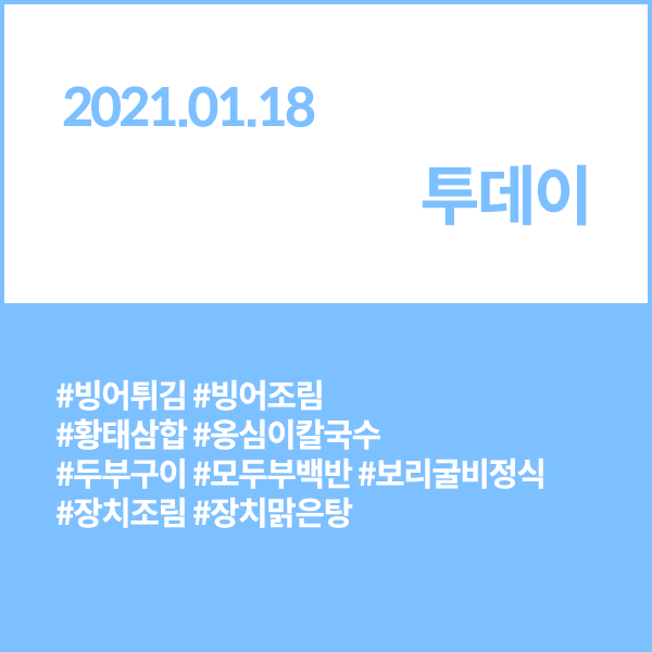 투데이 20210118 빙어튀김,빙어조림,황태삼합,옹심이칼국수,두부구이,모두부백반 (강원 인제) 보리굴비정식 (전남 영광) 장치조림,장치맑은탕 (서울 건대입구역)
