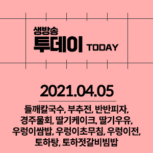 2021년 4월 5일 생방송 투데이 들깨칼국수,부추전,반반피자,경주물회,딸기케이크,딸기우유 (경주) 우렁이쌈밥,초무침,전 (안산) 토하탕 (수원) 토하젓갈비빔밥 (서울 등촌역)