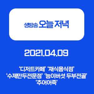 2021년 4월 9일 오늘 저녁 우리동네 간식지도 - 디저트카페, 채식음식점, 수제만두전문점 (서울 서래마을) 능이버섯 두부전골 (전북 무주) 추어어죽 (충남 홍성)