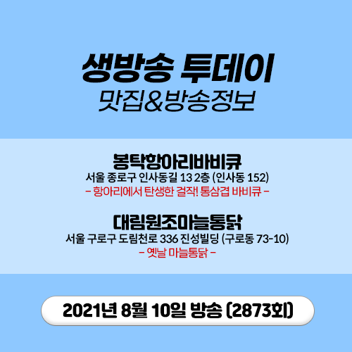 20210810 생방송 투데이 (2873) 경기 양주) 뒷목잡는 양주의 핫 플레이스 / 서울 인사동길) 항아리에서 탄생한 걸작! 통삼겹 바비큐 / 서울 도림천로) 옛날 마늘통닭