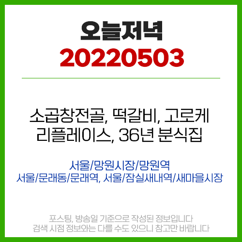 오늘 저녁 5월3일 [서울/망원시장/망원역] 소곱창전골,떡갈비,고로케 [서울/문래동/문래역] 리플레이스 [서울/잠실새내역] 36년 분식집